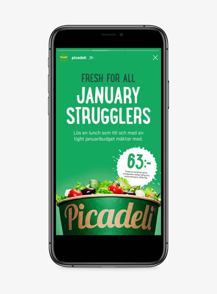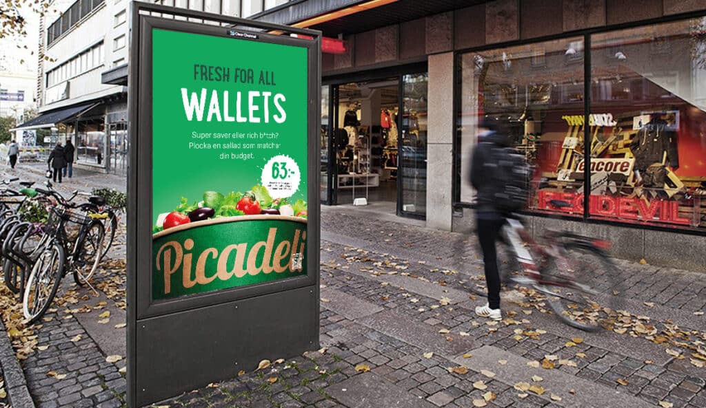 Picadeli is a European market-leading innovative salad bar company from Sweden. They have bars and products in Sweden, Finland, Germany, Estonia, Belgium, France and the USA. Picadeli is on a mission to democratize healthy food by making it affordable, appetizing, and accessible for everyone, and making fast food the opposite of junk food. In this particular campaign, Picadeli wanted to drive a change in eating behavior towards more healthy, by showcasing that their products are affordable and highlighting the price of a standard portion of their salad, 63 SEK.
